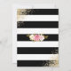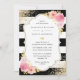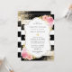 Faire-part de mariage florale noir et blanc élégant avec fleurs roses rousses et verdure dorée sur un arrière - plan rayé noir et blanc agrémenté de confettis dorés. Éléments correspondants disponibles.