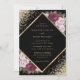 Elégante faire-part de mariage florale noire, bordeaux et rose vif, aux fleurs bordeaux et rose vif encadrant les détails mariages dans un cadre géométrique doré orné de confettis dorés. Éléments correspondants disponibles.