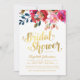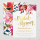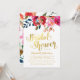 Faire-part de douche de mariée élégants avec un fond blanc classique, une exposition florale à l'aquarelle, un titre typographique en faux or stylé et un modèle de cortège de mariée moderne.