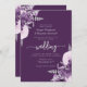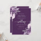 Cette élégante invitation à un mariage présente des bouquets de fleurs violettes et lilas agrémentés d'un faux feuillage argenté dans deux coins, sur un arrière - plan violet. Le texte personnalisable combine des polices sérif gris argenté, italique et écriture manuscrite. Le design floral est répété à l'envers.