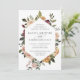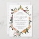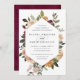 Une belle faire-part de mariage florale automnale avec vos noms en calligraphie écriture, nichée à l'intérieur d'une bordure géométrique de fleurs d'aquarelle et botaniques dans des tons de terre bouchée de marsala bordeaux, de rougissement, d'ivoire et de vert sauge. Personnalisez avec vos détails mariages sous.