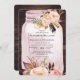 Belle faire-part de mariage bohème avec une bocale de mason décorée de fleurs roses, plumes et verdure. Personnalisez facilement ce faire-part de mariage floral avec vos détails mariages pour compléter votre pays rustique, ou fête de mariage bohème.