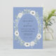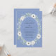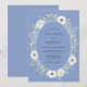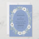 Des teintes de pervenche douce forment l'arrière-plan d'une délicate couronne de fleurs blanches et de verdure subtile. Ce design évoque une atmosphère douce et romantique, parfaite pour une réunion printanière ou estivale. La sensation aérienne et les éléments botaniques créent un visuel enchanteur.