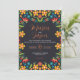 Cette Faire-part de mariage de fleurs botaniques colorées mexicaines présente une bordure fleurie vibrante composée de fleurs orange, rouge, jaune et bleue, entrecoupées de feuilles et de tiges verts et animés. La disposition symétrique encadre un espace blanc central, idéal pour le texte, et donne à la composition globale une apparence structurée et festive. Le style d'illustration plat et épuré et les couleurs vives et saturées évoquent une esthétique joyeuse d'inspiration folk, adaptée aux occasions festives comme les mariages.
