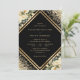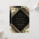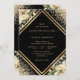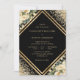 Elégante faire-part de mariage florale noire, ivoire et or avec détails mariages à l'intérieur d'un cadre géométrique doré et ornée de roses ivoire/crème et de confettis dorés. Éléments correspondants disponibles.