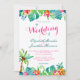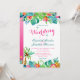 Cette élégante et moderne invitation de mariage tropical floral ombré, mettant en vedette les couleurs rose baie, fuchsia, rose paon, sarcelle et bleu turquoise, et un lettrage à la main tendance, est parfaite pour le couple qui aura un mariage de destination : sur une plage hawaïenne, un mariage sur une plage de Floride ou un mariage sur une plage des Caraïbes. Des images aquarelles d'hibiscus, de feuilles exotiques, d'oiseaux de paradis, de fleurs tropicales, d'ananas et de palmiers ornent la carte au recto et au verso. La couleur ombrée rose du verso de la carte peut être personnalisée selon vos préférences. Le texte est facilement personnalisable.
