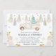 Elégant hiver Gold Floral Pine Trees design avec camion blanc, bonhomme de neige, flocons d'or et fleurs de parties scintillant blanche et or