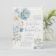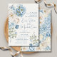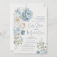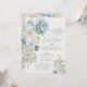 L'Aquarelle Bleue Dusty Romantique Floral Wedding Invitations présente des fleurs de céleste bleu poussiéreux et de delphinium avec une végétation d'eucalyptus agrémentée de papillons. Ajoutez votre texte personnalisé dans un élégant script de calligraphie moderne. Conçu pour vous par Evco Studio www.zazzle.com/store/evcostudio