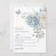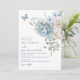 L'Aquarelle Bleue Dusty Romantique Floral Wedding Invitations présente des fleurs de céleste bleu poussiéreux et de delphinium avec une végétation d'eucalyptus agrémentée de papillons. Ajoutez votre texte personnalisé dans un élégant script de calligraphie moderne. Conçu pour vous par Evco Studio www.zazzle.com/store/evcostudio