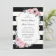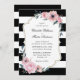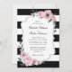 Elégante faire-part de mariage à fleurs blanches et blanches, vert encadrant les détails mariages d'un arrière - plan rayé noir et blanc. Éléments correspondants disponibles.