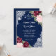 Elégante faire-part de mariage rustique bleu marine, bordeaux et rousse avec de belles fleurs d'aquarelle contre un burlap et arrière - plan dentelle décoré de lampes à cordes. Les détails du mariage sont écrits dans une police de script design.