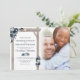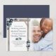 Cartes d'invitation de mariage bleu rustique avec un fond blanc tendance qui peut être changé en n'importe quelle couleur, un arche de mariage en bois rustique, des fleurs aquarelles bleu poussiéreux et bleu marine boho chic, un cœur sculpté avec les initiales du couple, une photo de la mariée et du marié, et un modèle de mariage moderne.