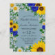 Invitation mariage campagnard rustique avec des tournesols vibrants, marguerites blanches traditionnelles et fleurs bleu marine contre un arrière - plan bleu avec respiration bébé et des accents de verdure botanique