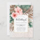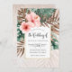 Invitation de mariage bohème chic avec des fleurs d'hibiscus rose poussiéreux associées à des feuilles de monstera et de palmier tropicales vertes et brunes sur un fond beige crémeux. Style d'invitation de mariage parfait pour les mariages tropicaux, de destination et de plage.