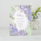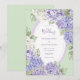 De magnifiques hortensias aquarelles violets et blancs sur un fond vert pastel. Un triple cadre coordonné violet ajoute à l'élégance de cette invitation de mariage. De belles fleurs en pleine floraison en cascade. Une charmante invitation de mariage pour un mariage en toute saison.
