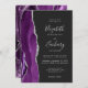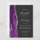 Le bord gauche de cette élégante faire-part de mariage moderne est orné d'une bordure d'aquarelle violette ornée d'une parties scintillant en faux argent. Le texte personnalisable combine écriture gris argenté pâle, copperplate et polices italiques sur un arrière - plan noir foncé. L'envers est assorti d'un design d'agate violet et argenté.