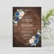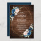 Faire-part de mariage géométrique florale bleu marine foncé avec élégant bouquet bleu marine, bleu royal, blanc, rose roux et vert sauge eucalyptus feuilles et élégant cadre géométrique neutre parties scintillant sur arrière - plan de bois rustique. Veuillez me contacter pour toute aide sur la personnalisation ou si vous avez besoin d'un autre produit avec ce design.
