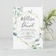 Faire-part de mariage avec des feuilles d'eucalyptus couleur vert menthe peints à la main et ornés d'un cadre géométrique doré blanc moderne.