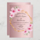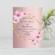 Un élégant faire-part de mariage tropical d'été. Avec un cadre géométrique en faux or décoré d'hibiscus rose pâle, fleurissent des fleurs tropicales avec un peu de verdure. Un faux arrière - plan métallique rose vif. Les noms de mariée et de mariée sont écrits avec un script de style moderne et artisanal. Texte noir. Dos : arrière - plan métallique rose faux.