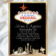 Ce faire-part de mariage propose un thème classique de Las Vegas sur un arrière - plan noir. Une image de la bande de Vegas est imprimée sur la partie inférieure en motif or. Un cadre or assorti borde l'invitation. L'enseigne rétro classique "Bienvenue à Las Vegas" est imprimée en haut. Vous pouvez personnaliser le panneau pour inclure vos propres informations de mariage personnalisées ou d'autres textes.