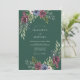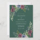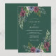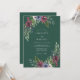 Cette conception présente un riche fond vert forêt orné de grappes florales sombres. Des roses bordeaux profondes et des anémones bleu poussiéreux créent un contraste saisissant sur un feuillage luxuriant d'eucalyptus et de vert sauge. Parfait pour un événement hivernal ou automnal, le style aquarelle évoque une atmosphère romantique et sophistiquée.