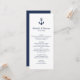 Conçue pour aller avec notre collection de mariage nautique avec ancre, cette élégante carte de menu côtière présente une ancre de bateau en bleu marine avec vos noms, date, heure et autres détails de menu. Dos de la carte en bleu uni assorti