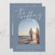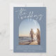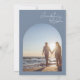Invitation de mariage avec arche en bleu poussiéreux qui présente un design de photo côtière douce avec des noms en script moderne et une élégance minimaliste. Un choix de rêve pour les mariages de printemps, côtiers ou de destination avec une atmosphère intemporelle et romantique.