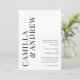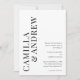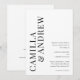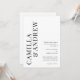 Faire-part de mariage moderne avec QR code typographique noir et blanc avec les noms et les détails des mariés en grand sur le devant. Le verso comporte un QR code avec des détails supplémentaires pour les invités, ce qui en fait une option tout-en-un économique.