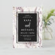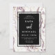 Ces invitations de mariage modernes et élégantes présentent un fond à l'aspect marbre violet et blanc avec des paillettes de faux or dispersées çà et là. La zone centrale contient un cadre noir foncé stylé avec votre texte d'invitation dans une typographie blanche tendance.