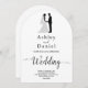 Cette élégante faire-part de mariage en arc noir et blanc est parfaite pour un mariage moderne. Le design simple présente une élégante calligraphie noire et une illustration de mariée et de mariée sur un arrière - plan blanc propre. La carte d'invitation comprend les détails du mariage au dos au lieu de payer une carte d'enceinte séparée.
