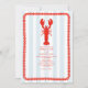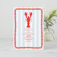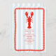 Illustration de homard au-dessus du texte rouge. Bleu rayé arrière - plan et rouge damier bordure.