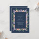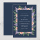 De délicates fleurs aux teintes lilas et pêche sont disposées avec art avec une verdure luxuriante. Ce design évoque une atmosphère romantique et éthérée, parfaite pour une célébration sophistiquée. Le fond bleu marine profond complète les éléments floraux, créant un visuel saisissant.