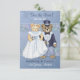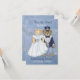 Mariés ourson adorable. Ce beau couple est habillé de leur tenue de mariage. Il porte un smoking et un haut-de-forme et elle est vêtue d'une robe de mariée et d'un voile. Un beau fond bleu clair présente un motif floral discret avec une bordure d'accent floral détaillée à l'avant et à l'arrière. Tout le texte est prêt à être personnalisé.