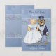 Adorables mariés ours en peluche. Ce beau couple est vêtu de leurs plus beaux atours de mariage. Il porte un smoking et un chapeau haut de forme et elle est en robe de mariée avec voile. Un beau fond bleu clair avec un motif floral discret et une bordure d'accent floral détaillée sur le devant et le dos. Tout le texte est prêt à être personnalisé.