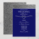 Invitation de mariage simple, moderne, élégante et glamour avec des paillettes argentées et bleues royales, avec un script calligraphique simple et un beau cœur en corde.