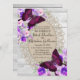 Ces magnifiques faire-part de mariage en bois blanc et dentelle présentent des papillons, des fleurs violettes et des roses crème rose. Parfait pour un mariage champêtre rustique ou pour une célébration de mariage DIY. Très élégant.