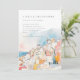 Faire-part de mariage méditerranéenne moderne et colorée avec une belle aquarelle à flanc de colline et paysage côtier en rose, bleu et orange, recouvert d'une police serif gris moderne. Ajoutez votre code QR mariage à l'inverse.