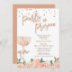 Invitation de mariage peach avec perles florales et prosecco avec un titre en calligraphie gras, un verre à champagne et des perles.