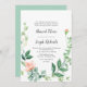 Un design mariage verdoyant avec un dos vert menthe et des fleurs de pêche avec feuillage vert. Un design parfait pour votre mariage d'été et de printemps. Vous pouvez personnaliser le texte et les détails de couleur de cette invitation de mariage.