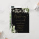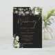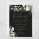 Cet élégant faire-part de mariage noir et or, avec de jolies lampes à cordes et de la verdure fleurie, peut être personnalisé avec vos informations dans la typographie moderne chic avec votre photo spéciale au verso. Conçu par Thisisnotme©