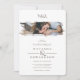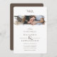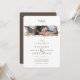 Une faire-part de mariage moderne et élégante présente des initiales monogrammées chic suivies d'une photo masquée dans un trait de brosse et d'un texte d'information mariage classique en couleur marron avec un dos brun clair.