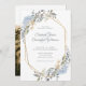 Floraux et feuilles bleu roux romantiques à l'aquarelle sur des invitations de mariage à cadre géométrique or. Ajoutez vos détails mariages à cette invitation à la couronne botanique moderne. Endroit pour ajouter votre photo de couple préférée au verso de l'invitation