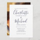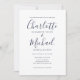 Avec des noms de style signature, cette élégante faire-part de mariage bleu et blanc bleu marine peut être personnalisée avec vos informations en lettres chic et votre photo spéciale au verso. Conçu par Thisisnotme©