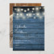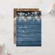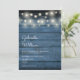 Un élégant faire-part de mariage rustique avec de jolies lampes à cordes au-dessus des noms du couple heureux, dans un élégant script au-dessus des détails mariages spéciaux sur un arrière - plan rustique en bois bleu marine. Le verso présente votre photo spéciale. Conçu par Thisisnotme©