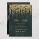 Illustration de branches d'arbres à la végétation luxuriante et sauvage et feuillage suspendu, en numériquement superposées à l'or, sur un arrière - plan émeraude vert émeraude, décore cette décoration cet été automne ou mariage d'hiver sauf l'invitation de la date avec un thème forestier enchanté. Un mariage élégant et moderne garde la date pour un conte de fées. Parfait pour les épouses qui aiment le cadre de la forêt de contes de fées, la forêt de fées ou le thème du jardin de fées et vert émeraude et or.