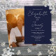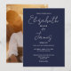 Ce faire-part de mariage de script minimaliste bleu marine peut être personnalisé avec vos informations en typographie chic et photo spéciale au verso. Conçu par Thisisnotme©