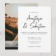 Invitation vos invités dans un style intemporel avec cet élégant faire-part de mariage photo moderne en noir et blanc avec typographie fluide et une disposition épurée et minimaliste. La palette monochrome et la photo personnalisée apportent une touche sophistiquée et romantique, ce qui rend ce design parfait pour les mariages classiques, chic, formels ou contemporains. Avec une calligraphie noire et un espace pour inclure votre photo de fiançailles ou de couple, cette invitation est idéale pour les couples à la recherche d'une façon simple mais étonnante d'annoncer leur grand jour.