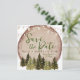 Ce beau bois rustique à deux côtés de la forêt, à l'exception de l'invitation à la date, impressionne vos invités. La magnifique aquarelle illustration design est composée d'une tranche de bois rustique superposée avec des lampes à baldaquin et des arbres de la forêt aquarelle dans différentes nuances élégantes de vert chasseur, de brun chocolat foncé et de teintes de tanins. N'oubliez pas d'ajouter votre photo de fiançailles à l'arrière. Cliquez sur Modifier à l'aide de l'outil de conception pour apporter des modifications supplémentaires à cette invitation.