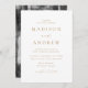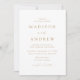 Faire-part de mariage minimaliste et moderne avec vos détails mariages en lettrage doré avec accents de script de calligraphie avec un arrière - plan blanc. L'arrière du faire-part de mariage branché affiche votre photo de fiançailles vertical. Conçu pour coordonner avec notre collection de mariages Modern Elegance.