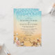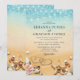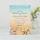 Cartes d'invitation de mariage de destination de plage tropicale avec un fond ombré rustique jaune à bleu aquarelle, étoile de mer, coquillages, guirlandes lumineuses, deux cœurs dans le sable avec vos initiales, et un modèle de mariage élégant facile à personnaliser.